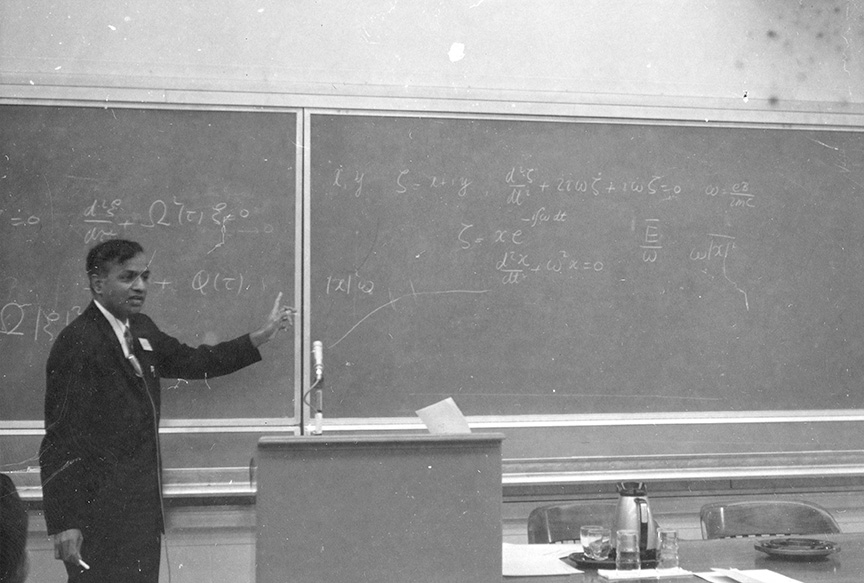 Subrahmanyan Chandrasekhar lecturing at a blackboard. Photo Credit: AIP Emilio Segrè Visual Archives, Physics Today Collection