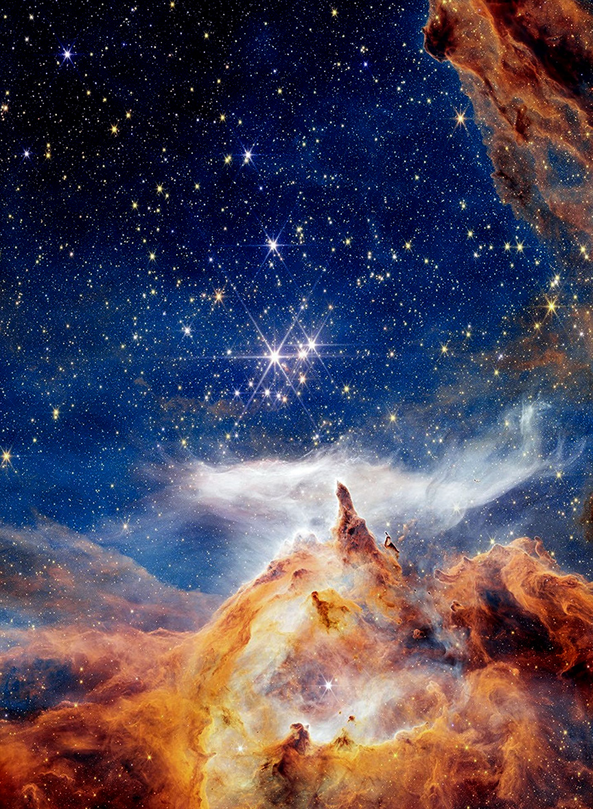 The third plate depicts a winter scene fit for a holiday greeting card. Above what appears to be a snowy mountainscape, is a clear sky packed with colorful lights. The ridged mountainscape is in fact part of the nebula NGC 6357, as captured by NASA’s James Webb Space Telescope. The speckling of lights in the sky above are bursts of high-energy X-rays from active stars, detected by Chandra.