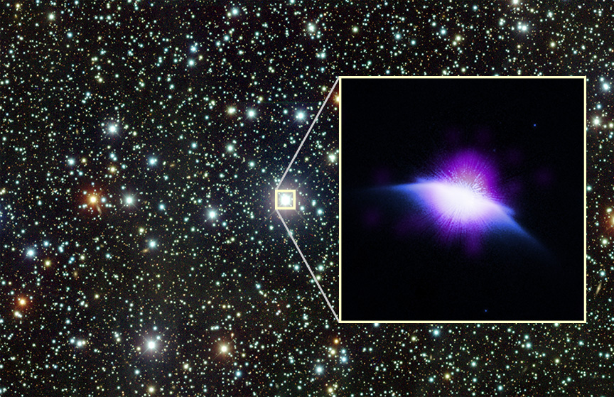 These images show the star HD 61005 with X-rays from the Chandra X-ray Observatory as well as infrared data from Hubble Space Telescope. A view in optical light from a telescope in Chile shows the larger field that HD 61005 is located in. Astronomers recently used Chandra to discover an “astrosphere,” a wind-blown bubble, around HD 61005, the first seen around a star like the Sun.