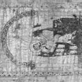 A photograph of one page of the Archimedes Palimpsest. Visible and UV light cannot see Archimedes' text under the gold painting done by a 20th Century forger. The text is oriented sideways like this when scanned.