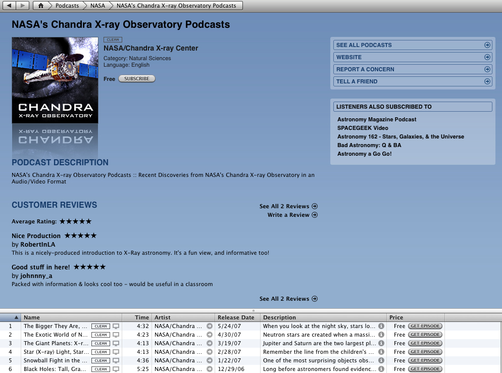 Chandra's podcasts are available on its main website (chandra.harvard.edu), but that's not the only place to find them. Apple's popular iTunes Music Store acts as one major distribution point for podcasts, and Chandra's can usually be found at #25-30 in the Natural Sciences category. To cast an even wider net, Chandra podcasts are linked from the NASA and Smithsonian web portals, as well as podcast portals such as PodcastAlley, PodcastPickle and LearnOutLoud.com, among others. Chandra podcasts are also advertised via news aggregators or "podcatchers" such as Feedburner via the RSS feed. Recently, Chandra podcasts were also added to YouTube. The Chandra podcasts have been used in pleasantly surprising ways. For example, teachers have reported using them in classrooms as introductions to astronomical topics.