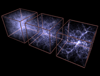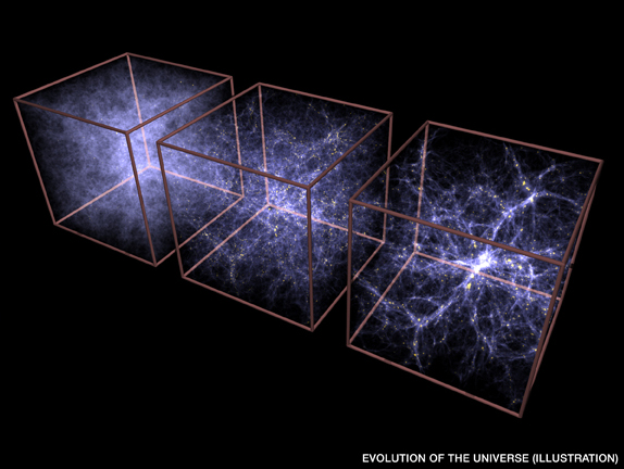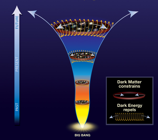 The dark energy effects are qualitatively illustrated on a figure (at right) showing how the scale of the Universe (bottom) and the growth of large structures (top) in it are thought to change with time. The change in scale of the Universe is what supernova work and other distance techniques have measured. The growth of structure is represented by the weight of galaxy clusters, from both the formation of new objects and the overall increase in mass of existing clusters.