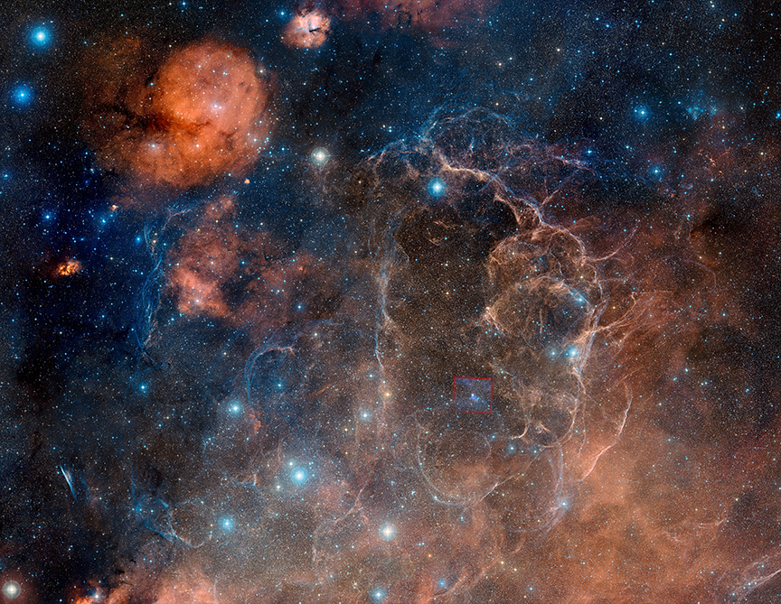 The supernova that formed the Vela pulsar exploded over 10,000 years ago. This optical image from the Anglo-Australian Observatory's UK Schmidt telescope shows the enormous apparent size of the supernova remnant formed by the explosion. The full size of the remnant is about eight degrees across, or about 16 times the angular size of the moon. The red square near the center shows the Chandra image with a larger field-of-view than used for the movie, with the Vela pulsar in the middle.