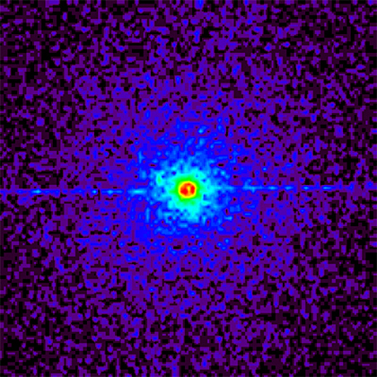 The image is an X-ray astronomical image of the binary X-ray source Cygnus X-3, which is a compact binary system composed of a black hole and a white dwarf star. The image is dominated by shades of blue and purple, with a bright yellow and red spot in the center. The observation shows a halo around the X-ray source Cygnus X-3. The halo (beyond the yellow ring in the center) is due to scattering by interstellar dust grains along the line of sight to the source. The sharp horizontal line is an instrumental effect. The X-ray emission from Cygnus X-3 is due to matter falling from a normal star onto a nearby neutron star or black hole. Its X-ray emission varies regularly with a 4.8 hour period, as the compact star circles a companion star. The radiation from the halo is delayed and smeared out, so the variations are damped. By observing the delays and smearing at different parts of the halo, the distance to the X-ray source is found to be 30,000 light years.