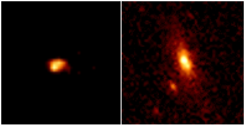 X-ray (left) and Optical (right) Images of Veiled Black Hole. The left hand panel shows the Chandra X-ray Observatory image of a powerful point-like source of X rays. The Hubble Space Telescope image (right panel) shows the spiral galaxy with which the X-ray source is associated. The X-ray source is located at the center of the galaxy, and has a deficit of low energy X rays, consistent with absorption by a thick cloud of gas. The combination of powerful X-ray emission, absorption of low energy X-rays, and the relatively normal optical appearance of the galaxy suggests that the source is a rare type of black hole called a Type 2 quasar.