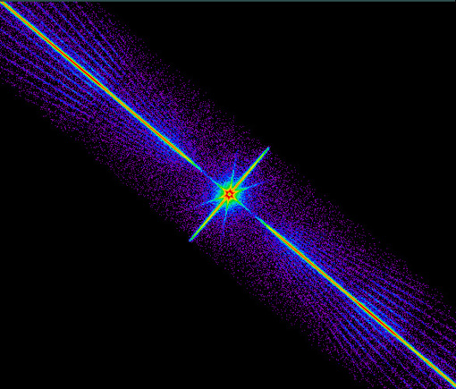 XTE J1118+480: A black hole orbited by a companion star about 5000 light years from Earth. Caption: This Chandra X-ray Observatory image is a spectrum of a black hole, which is similar to the colorful spectrum of sunlight produced by a prism. These data reveal that a flaring black hole source has an accretion disk that stops much farther out than some theories predict. Scientists theorize that the accretion disk is truncated there as the material erupts into a hot bubble of gas before taking its final plunge into the black hole. This provides a better understanding of how energy is released when matter spirals into a black hole. Chandra X-ray Observatory LETG /ACIS Image |