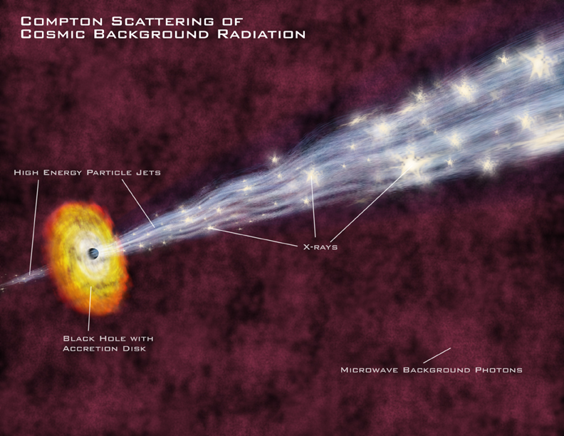 As the electrons in the jet fly away from the quasar at near the speed of light, they move through the sea of cosmic background radiation left over from the hot early phase of the universe. When a fast-moving electron collides with one of these background photons, it can boost the photon's energy up into the X-ray band.