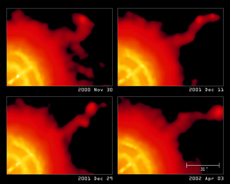 This series of 13 individual Chandra images of the Vela Pulsar Jet gives astronomers a new look at the crossbow-shaped nebula and the central pulsar. Composited into a time-lapse movie, the images reveal a powerful jet of high-energy particles that is varying erratically.