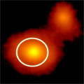 QuickTime MPEG The first illustration in this sequence shows a doomed star (orange circle) that wanders so close to a giant black hole that the black hole's enormous gravity stretches the star until it is torn apart. Some of the disrupted star's mass (indicated by the white stream) is swallowed by the black hole, while the rest is flung away into the surrounding galaxy. The second illustration shows how the gas that was pulled towards the black hole forms a disk and is heated before being swallowed by the black hole. The third illustration shows a much fainter disk, after about ten years have elapsed, when most of the gas has been swallowed by the black hole.