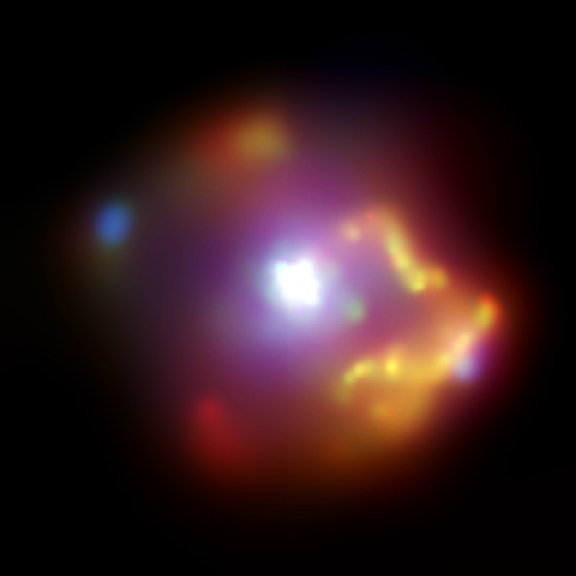 The image reveals a central intense white blaze of high-energy particles about 3 light years across created by the rapidly rotating neutron star, or pulsar. Surrounding the white blaze is a shell of hot gas 40 light years in diameter that marks the outward progress of the supernova shock wave.