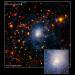 This artist's concept illustrates one of the largest smash-ups of galaxies ever observed. NASA's Spitzer Space Telescope spotted the four galaxies shown here (yellow blobs) in the process of tangling and ultimately merging into a single gargantuan galaxy. Though the galaxies appear to be fairly intact, gravitational disturbances have caused them to distort and twist, flinging stars (white dots) everywhere like sand. Other nearby galaxies can be seen as small, bluish blobs. The so-called "quadruple merger" is the largest known merger between galaxies of a similar size. While three of galaxies are about the size of our Milky Way, the fourth (center of image) is three times as big. All four of the galaxies are blob-shaped ellipticals instead of spirals like the Milky Way. The plume shown emanating from the biggest galaxy contains billions of stray stars -- almost three times as many as are in the Milky Way -- kicked out during the merger. About half of the stars in the plume will fall back and join the new galaxy, making it one of the biggest galaxies in the universe. The quadruple merger is part of a giant galaxy cluster, called CL0958+4702, located nearly five billion light-years away.