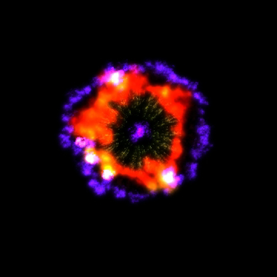 The animation illustrates the events following the supernova 1987A outburst. The blue ring is previously observed material ejected from the star thousands of years ago. The expanding orange and yellow shell is multimillion degree, X-ray emitting gas produced by the explosion. Portions of the blue ring light up when struck by the X-ray shell.