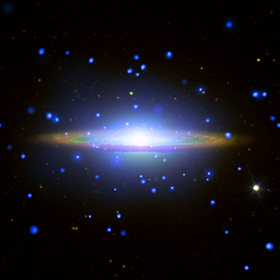 The Sombrero galaxy lies at the southern edge of the Virgo cluster of galaxies and is one of the most massive objects in that group, equivalent to about 800 billion suns. This Chandra X-ray image of Sombrero (a.k.a. M104) shows hot gas in the galaxy and point sources that are a mixture of galaxy members and background objects. In this image, Chandra low energy X-rays (0.3-1.5 keV) are color-coded orange and high energy X-rays (1.5-7.0 keV) are in blue. The Chandra image shows hot gas in the Sombrero galaxy and point sources that are a mixture of galaxy members and background objects.