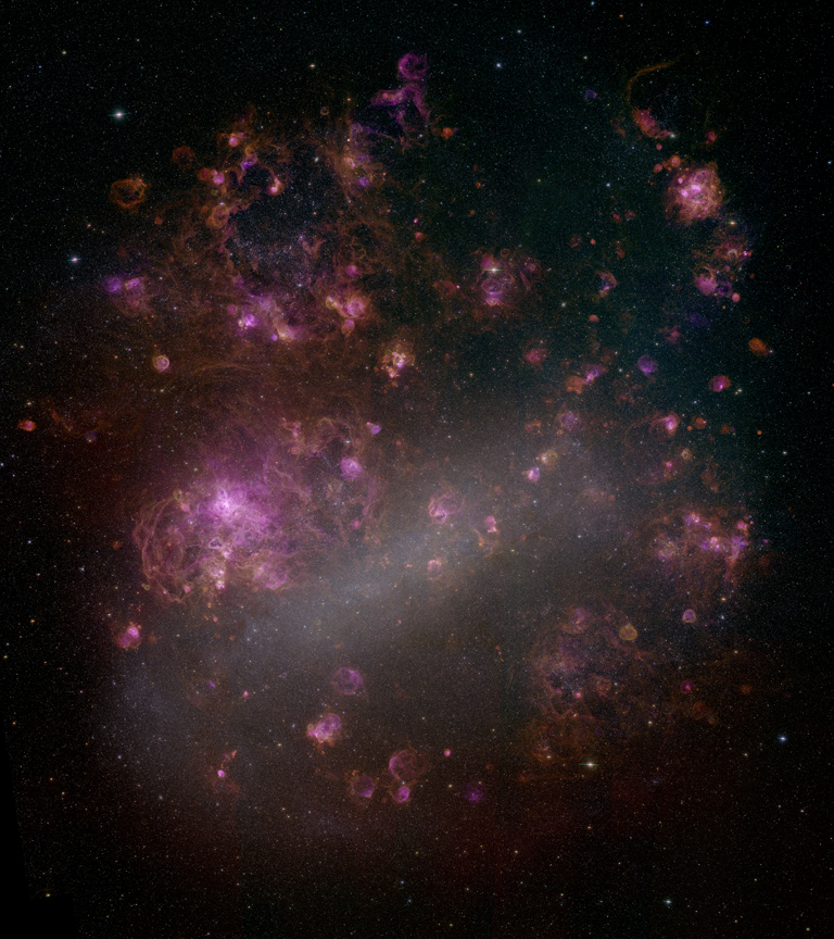 Found in the nearby Large Magellanic Cloud, 30 Doradus is one of the largest massive star forming regions close to the Milky Way. Enormous stars in 30 Doradus, also known as the Tarantula Nebula, are producing intense radiation and searing winds of multimillion-degree gas that carve out gigantic bubbles in the surrounding cooler gas and dust. Other massive stars have raced through their evolution and exploded catastrophically as supernovae, expanding these bubbles into X-ray-brightened superbubbles. They leave behind pulsars as beacons of their former lives and expanding supernova remnants that trigger the collapse of giant clouds of dust and gas to form new generations of stars.
