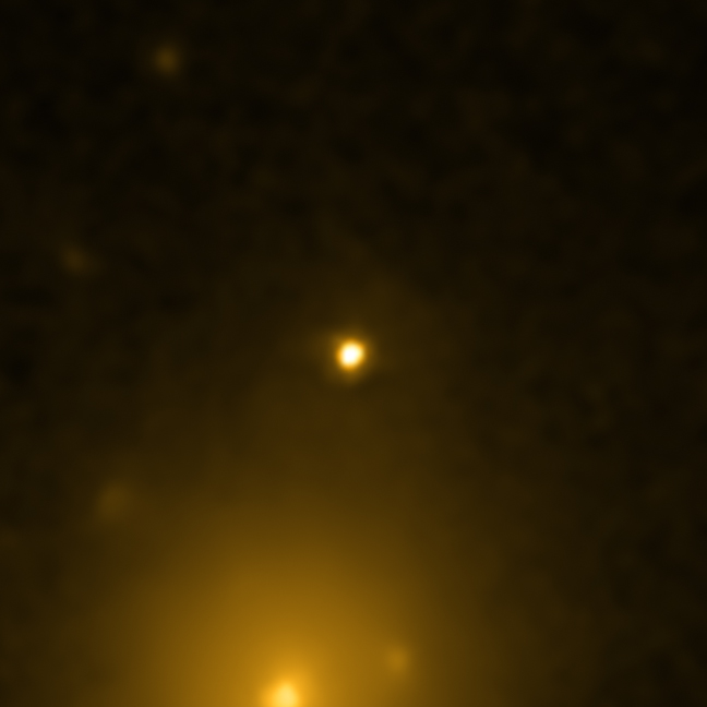 The position of SN 2007on in the Chandra image is shown with a white circle, plotted with a radius that is much larger than the uncertainty in the supernova's position. The initial search for the progenitor of SN 2007on, reported in Nature, argued that the X-ray source lying inside the circle is the likely progenitor for the supernova. This claim was based on two main pieces of evidence: (1) the chance of a source being so close by coincidence is small, and (2) the X-ray source has similar properties to those expected for a particular type of progenitor predicted by theoretical work.