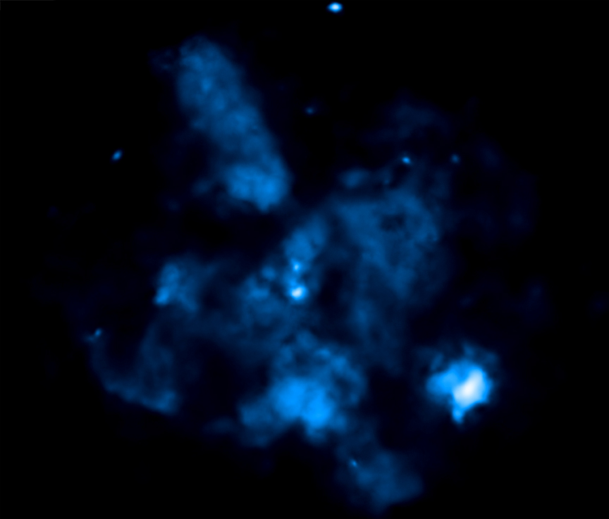 Multimillion-degree gas detected in X-rays (blue) by the Chandra X-ray Observatory comes from shock fronts -- similar to sonic booms --formed by these stellar winds and by supernova explosions. This hot gas carves out gigantic bubbles in the surrounding cooler gas and dust shown here in infrared emission from the Spitzer Space Telescope (orange).