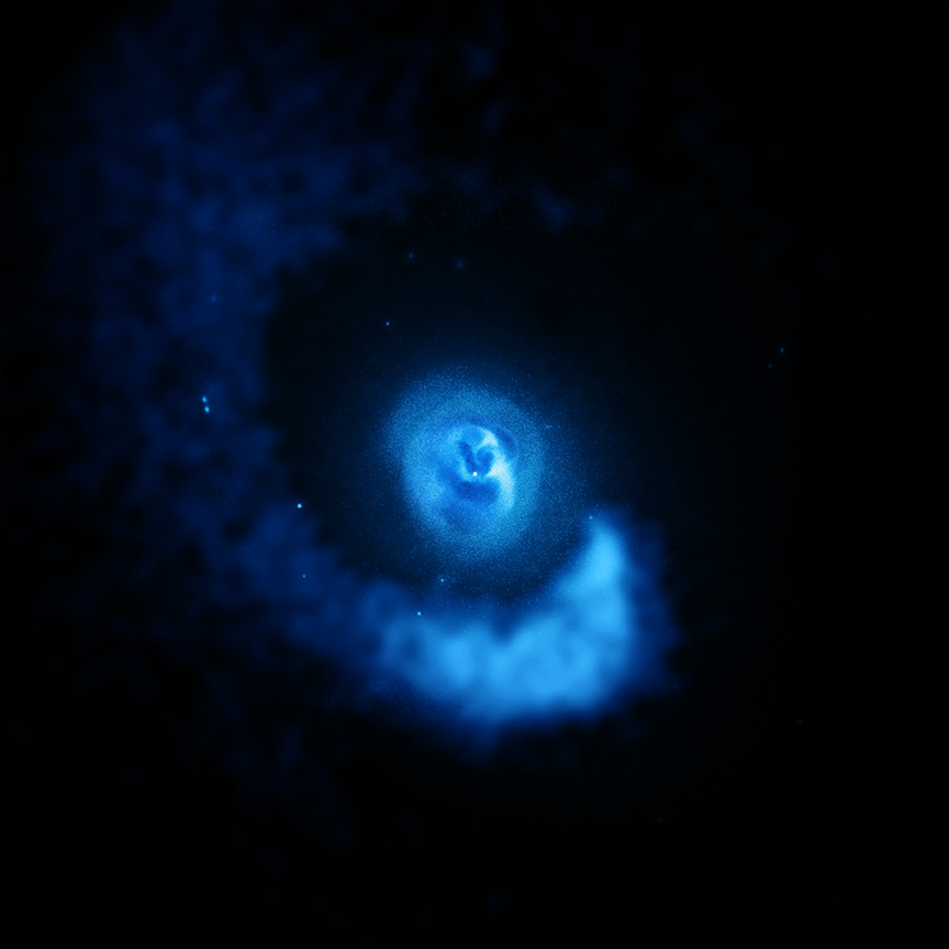 A huge spiral structure in the hot gas - spanning almost a million light years - is seen around the outside of the image, surrounding a giant elliptical galaxy at the center. This spiral was created when a small cluster of galaxies smashed into a larger one that surrounds the central elliptical galaxy.