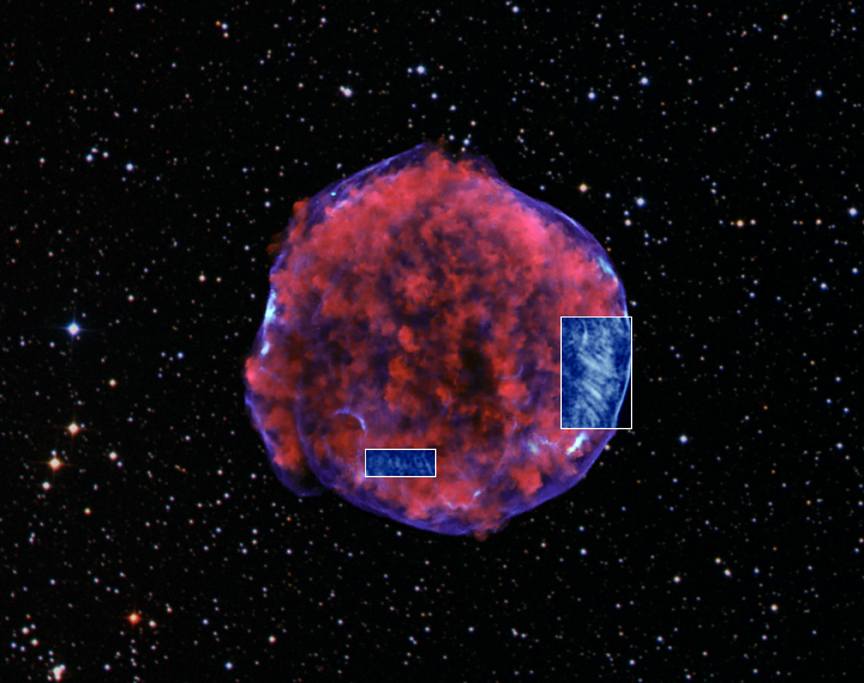 This Chandra image shows the higher energy X-rays detected from the Tycho supernova remnant. These X-rays show the expanding blast wave from the supernova, a shell of extremely energetic electrons. Close-ups of two different regions are shown, region A containing the brightest stripes and region B with fainter stripes. The stripes are areas where the magnetic fields are much more tangled and the particle motion is much more turbulent than surrounding areas. Electrons become trapped in these regions and emit X-rays as they spiral around the magnetic field lines.