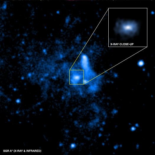 The large image contains X-rays from Chandra in blue and infrared emission from the Hubble Space Telescope in red and yellow. The inset shows a close-up view of Sgr A* only in X-rays, covering a region half a light year