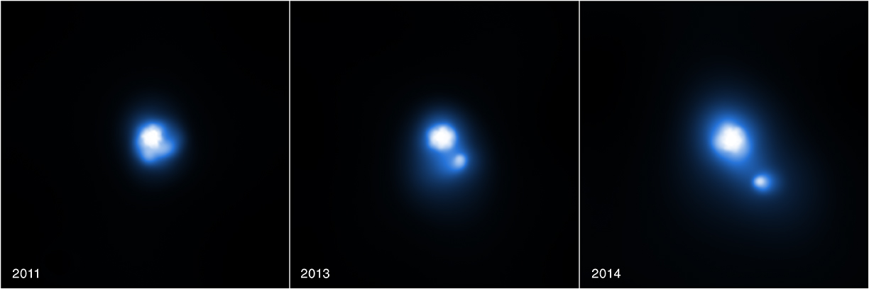 Researchers think that the pulsar knocked out the chunk of debris, which spans over a hundred times the size of the Solar System, when it collided with the disk around the massive star while traveling in its elliptical orbit lasting 41 months. (An artist's illustration shows the pulsar just after having collided with the disk.) Astronomers came to this conclusion after analyzing three separate Chandra observations taken between December 2011 and February 2014, as labeled in the three images. The bright source in the center of these images is the binary system, while the smaller point-like source to the lower right seen in the second two observations is the clump that has been dislodged.