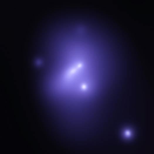 There is a region of bright X-ray emission (seen as blue-white) near the middle of the cluster, but not exactly at the center. The location of this "core" of gas suggests that the cluster has had a collision or interaction with another massive system of galaxies relatively recently, perhaps within about the last 500 million years. This would cause the core to "slosh" around like wine in a moving glass and become offset as it appears to be in the Chandra data. Such a merger would not be surprising, given that astronomers are observing IDCS J1426 when the Universe was only 3.8 billion years old. So that an enormous structure can form so rapidly, scientists think mergers with smaller clusters would likely play a role in a large cluster's growth.