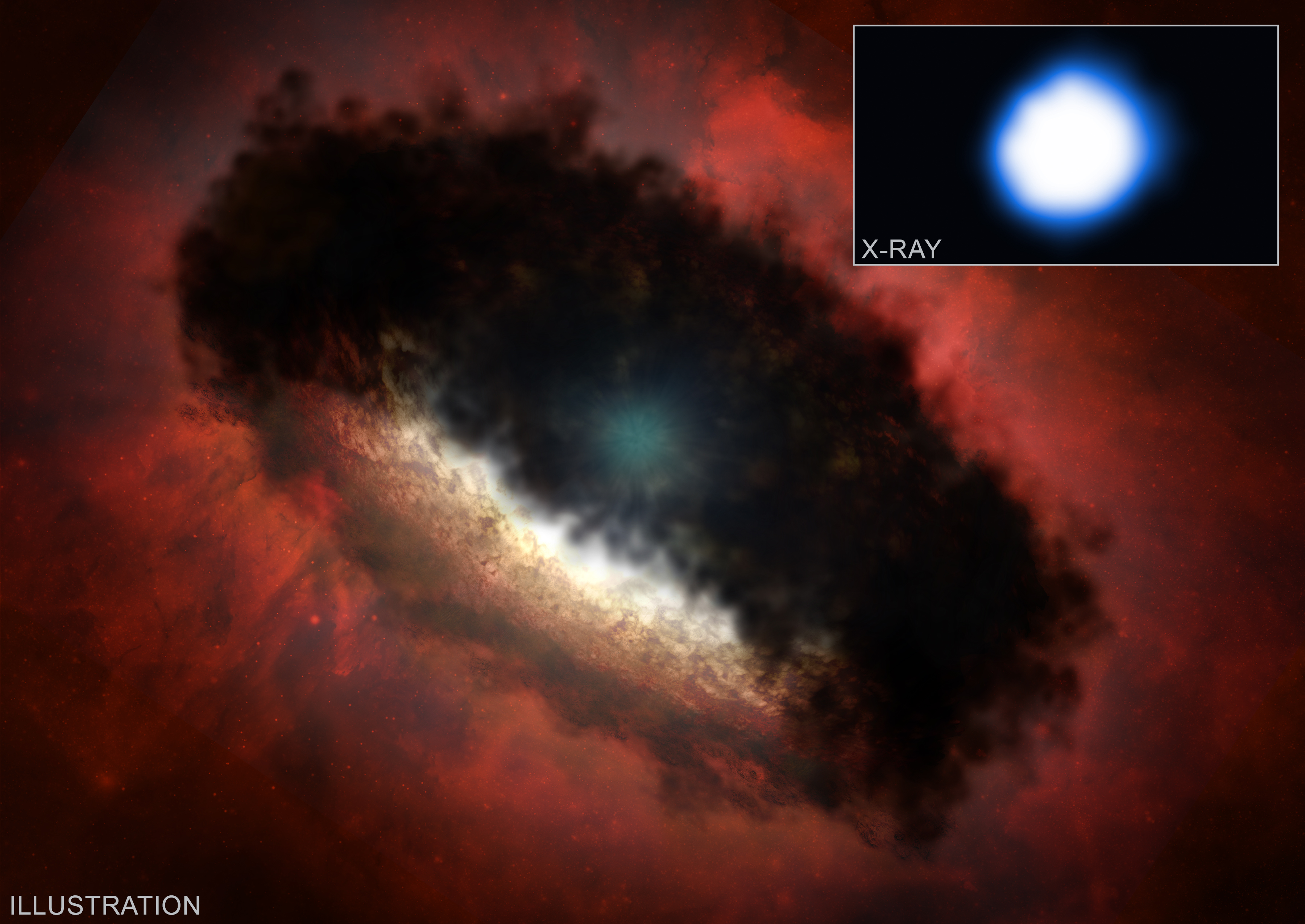 The illustration shows HOPS 383 surrounded by a donut-shaped cocoon of material (dark brown) — containing about half of the protostar's mass — that is falling in towards the central star. Much of the light from the infant star in HOPS 383 is unable to pierce through this cocoon, but X-rays from the flare (blue) are powerful enough to do so. Infrared light emitted by HOPS 383 is scattered off the inside of the cocoon (white and yellow). A version of the illustration with a region of the cocoon cut out shows the bright X-ray flare from HOPS 383 and a disk of material falling towards the protostar.