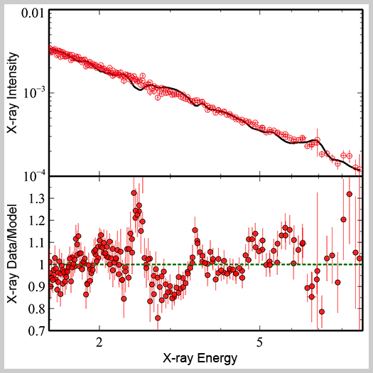 Here the Chandra spectrum (red) of Perseus' central black hole shows the intensity of X-rays as a function of X-ray energy, along with an example (black) of a model X-ray spectrum predicted if axion-like particles were actually being converted from and into photons. To highlight the distortions that could have been detected, the data divided by the example model are also shown.
