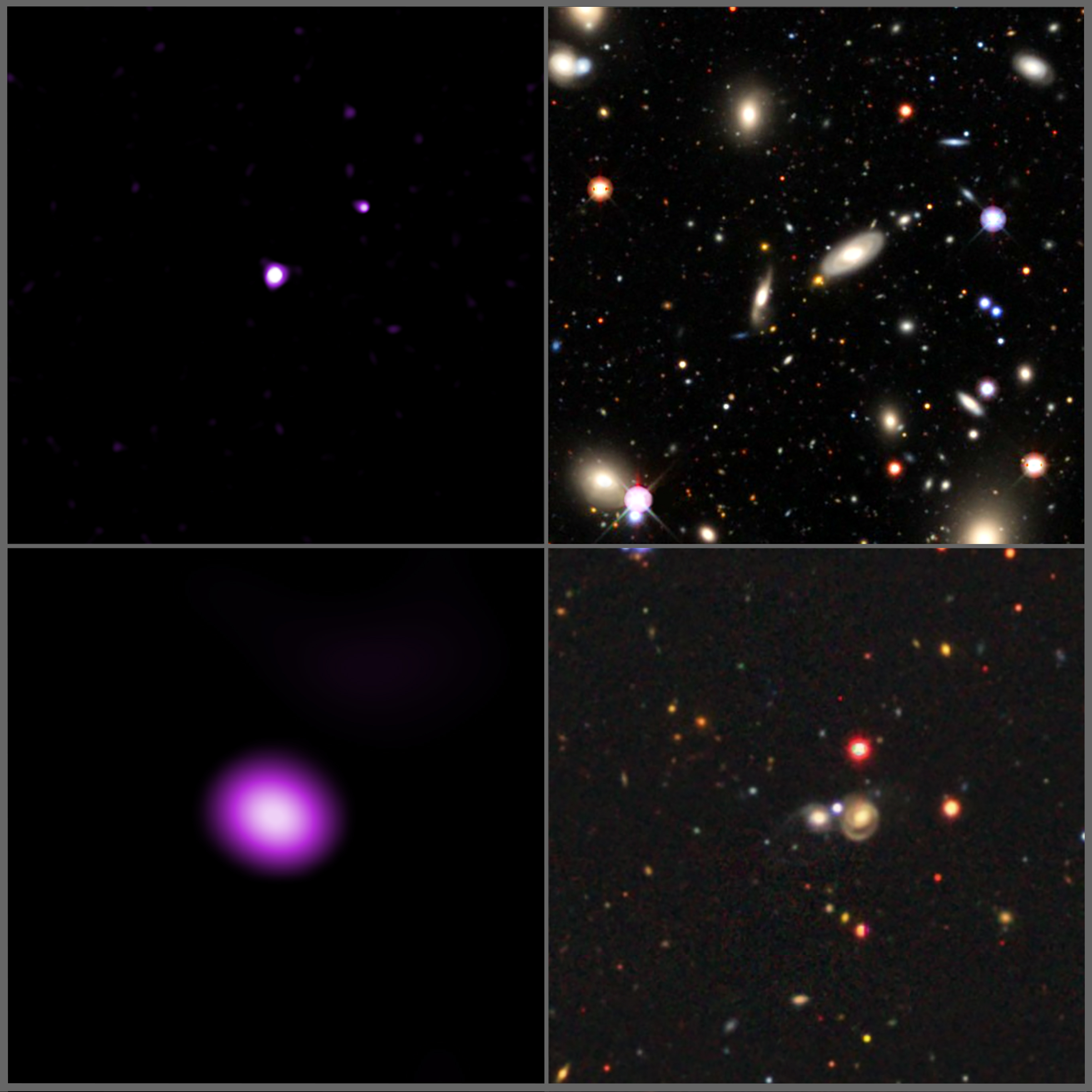 This graphic shows two of the galaxies from the new study, with Chandra X-ray data in purple and optical data from the Sloan Digital Sky Survey (SDSS) in red, green and blue. These black holes were found in galaxies that are dim in optical light, but bright in X-rays. Astronomers have dubbed these “XBONGs” (for X-ray bright, optically normal galaxies). While scientists have been aware of XBONGs for several decades, an explanation for their unusual properties has been unclear.