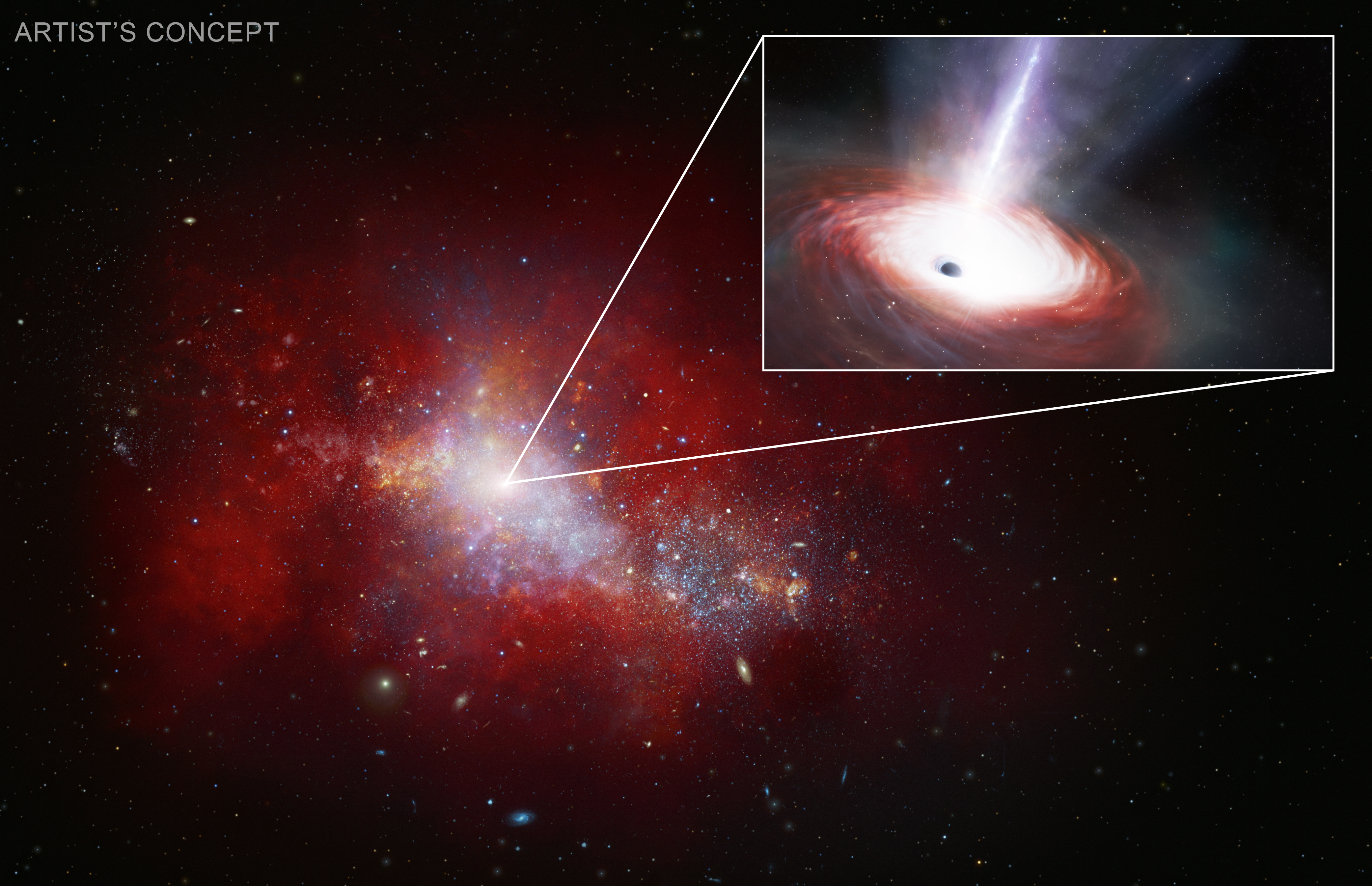 This release features an illustration of the galaxy in which black hole LID-568 resides. A smaller illustration of black hole itself, in an outlined box, is superimposed on top of the galaxy image toward our upper right. Two lines extend from a single point in the middle of the galaxy and terminate on corners of the outlined box containing the black hole illustration. The placement of the lines and outlined box indicate that the superimposed black hole image is an enlargement of a tiny place in the center of the galaxy.