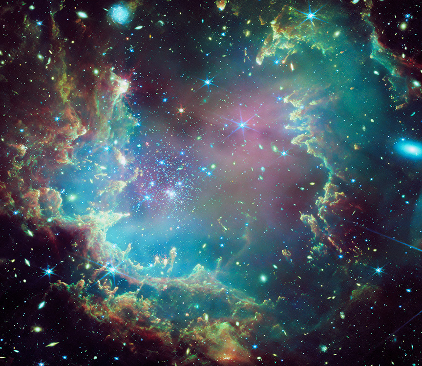 NGC 602 is a star cluster that lies on the outskirts of the Small Magellanic Cloud, one of the closest galaxies to the Milky Way. These images combine X-rays from Chandra and infrared data from James Webb (JWST). The dark ring-like structure in the JWST data is made up of dense clouds of dust. Chandra’s X-rays show young, massive stars that are illuminating the dust clouds, sending high-energy light into interstellar space. These X-rays are powered by winds flowing from the young, massive stars that are sprinkled throughout the cluster.