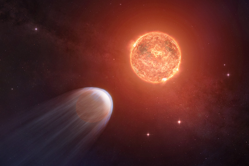 An artist’s illustration depicts a Jupiter-sized planet to the lower left closely orbiting a faint red star. New data from Chandra shows that powerful X-rays from the star’s surface are tearing away the atmosphere of the planet represented by the blue tail. Astronomers used X-ray data from Chandra (separate image) to measure the amounts of X-rays from TOI 1227 that are striking the planet. They estimate that the planet is losing a mass equivalent to a full Earth’s atmosphere about every 200 years, causing it to ultimately shrink from the size of Jupiter down to a small, barren world.