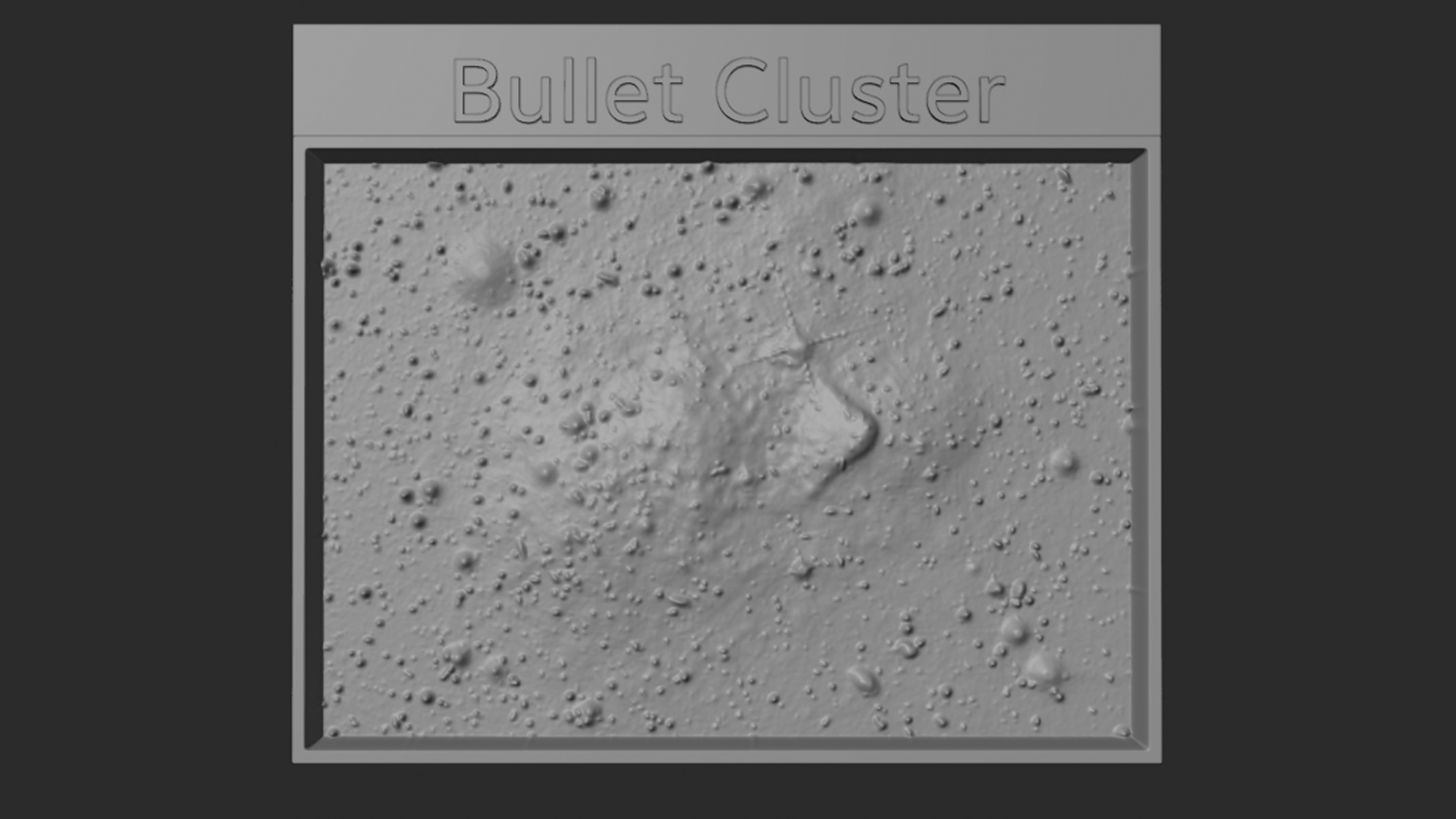 This tactile plate is a physical relief map based on the intensity of Chandra X-ray data along with lensing and optical data featuring the Galaxy Cluster 1E 0657-56, known as the Bullet Cluster. The galaxy cluster is composed of hundreds of galaxies that are held together by their mutual gravitational attraction. In the plate, we can touch a large number of dots and tiny spiral shapes scattered across a plain background. These sources represent individual galaxies within the cluster. The most prominent feature of the plate is the large puffy object in the center overlaying dozens and dozens of the galaxies, which is more concentrated and is shaped like a very large bullet. The bullet-shaped clump on the right side is the hot gas from one cluster, which passed through the hot gas from the other larger cluster during the collision. On either side of the large bullet are other cloudy areas where astronomers find most of the mass in the clusters. The concentration of mass is determined using the effect of so-called gravitational lensing, where light from distant objects is distorted by intervening matter. Most of the matter in the clusters is separate from the normal matter, giving direct evidence that nearly all of the matter in the clusters is dark matter.