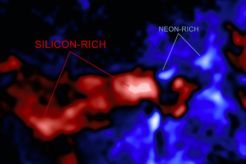 This graphic features Chandra data of the Cassiopeia A (Cas A) supernova remnant that reveals that the star’s interior violently rearranged itself mere hours before it exploded. The main panel of this graphic is Chandra data that show the location of different elements in the remains of the explosion: silicon (red), sulfur (yellow), calcium (green) and iron (purple). The blue color reveals the highest-energy X-ray emission detected by Chandra in Cas A and an expanding blast wave. The inset reveals regions with wide ranges of relative abundances of silicon and neon. These data, plus computer modeling, reveal new insight into how massive stars like Cas A end their lives.