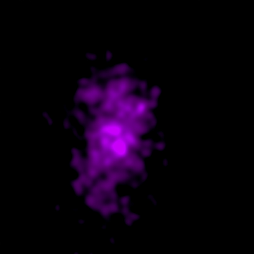 The neon purple cloud sits at the heart of the image, surrounding the most densely-packed part of the cluster. This cloud, which spreads vertically across the cluster, is multimillion-degree gas observed by Chandra. The two clumps of observable galaxies, and the spread of superheated gas, reveal that the Champagne Cluster is in fact two clusters in the process of colliding.