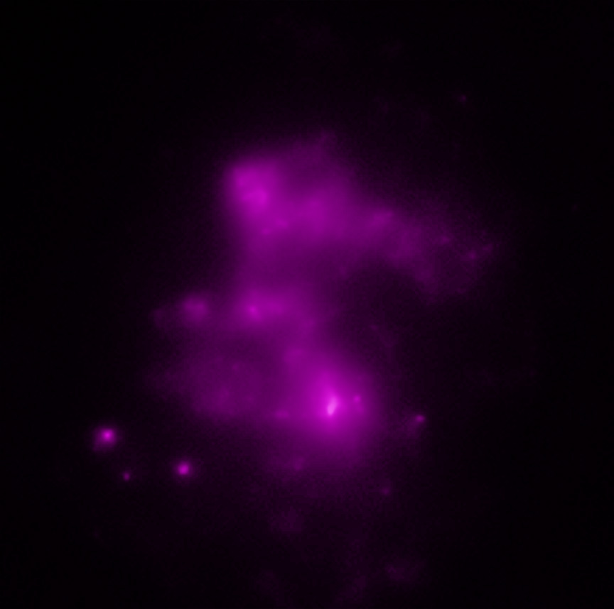 Chandra’s seasonal greetings begin with NGC 4782 and NGC 4783, a pair of colliding galaxies when oriented in a certain way resembles a snowman. The top and bottom of the snowman are each elliptical galaxies, separated by a distance of about 170 million light-years. The galaxies, seen in an image from NASA’s Hubble Space Telescope (gray), are bound together through gravity. X-rays from Chandra (purple) show a bridge of hot gas between the two galaxies, like a winter scarf.