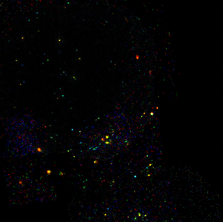 The second plate strongly resembles a Christmas tree bedecked with twinkling lights. The tree is actually NGC 2264, a relatively young nebula where new stars are forming. The tree’s branches, which sweep back and forth in a roughly conical shape, are clouds of dust and gas, all from optical light captured by astrophotographer B. Vuk. Tucked into these branches are specks representing lights and baubles in X-rays from Chandra and XMM-Newton; baby stars growing inside the nebula.