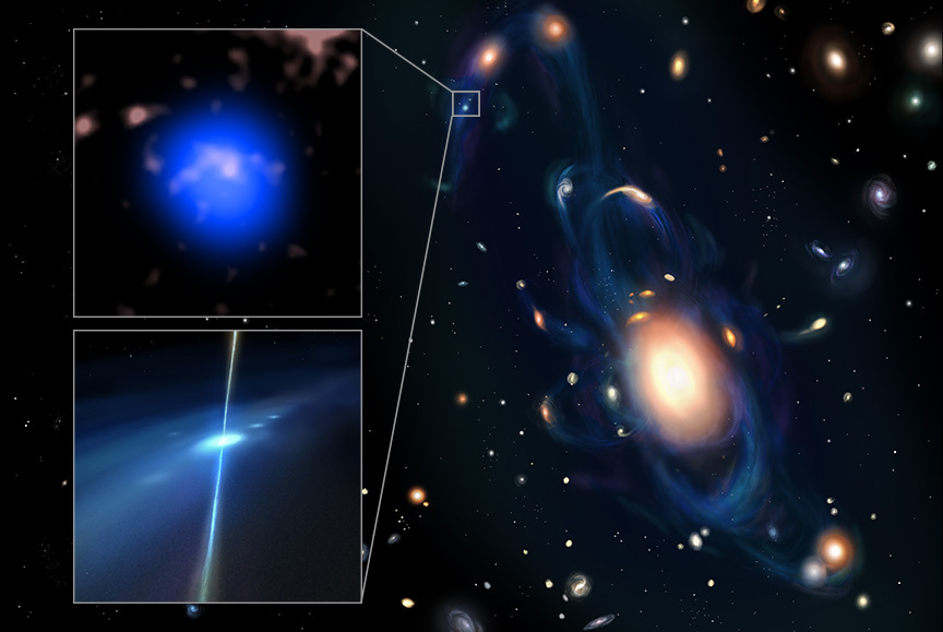These graphics depict the likely discovery of a collision between two neutron stars, made by Chandra and other telescopes, in a tiny galaxy buried in a huge stream of gas. This is the first time that a neutron star collision has been spotted in such a setting. Two artist’s illustrations — one showing a full field view and the other a close-up side view — depict what astronomers think is happening in the event known as GRB 230906A. First picked up by Fermi in September 2023, the event was then observed by Swift to provide a more accurate position followed by observations with Chandra and Hubble. The Chandra data gave the researchers an even more accurate position for the GRB, showing it is likely located in a tiny galaxy seen in a Hubble image.