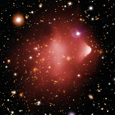 A collision of two large clusters of galaxies about 3.8 billion light years away.