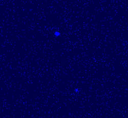 A Chandra image of neutron star KS 1731-260, remarkably cool after 12 years of being bombarded with hot gas from a companion star, not visible here. The now dim KS 1731-260 is the light blueobject slightly above the midline of this image.