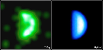 Venus in X-rays looks similar to Venus in visible light, but there are important differences. The optically visible Venus is due to the reflection of sunlight and, for the relative positions of Venus, Earth and Sun during these observations, shows a uniform half-crescent that is brightest toward the middle. The X-ray Venus is slightly less than a half-crescent and brighter on the limbs.