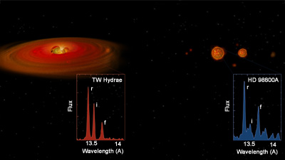 Kastner and his colleagues found examples of each type of behavior in their study. One star, TW Hydrae, namesake of the TW Hydrae Association, exhibited features in its X-ray spectrum that provide strong, new evidence that matter is accreting onto the star from a circumstellar disk. They concluded that matter is guided by the star's magnetic field onto one or more hot spots on the surface of the star.