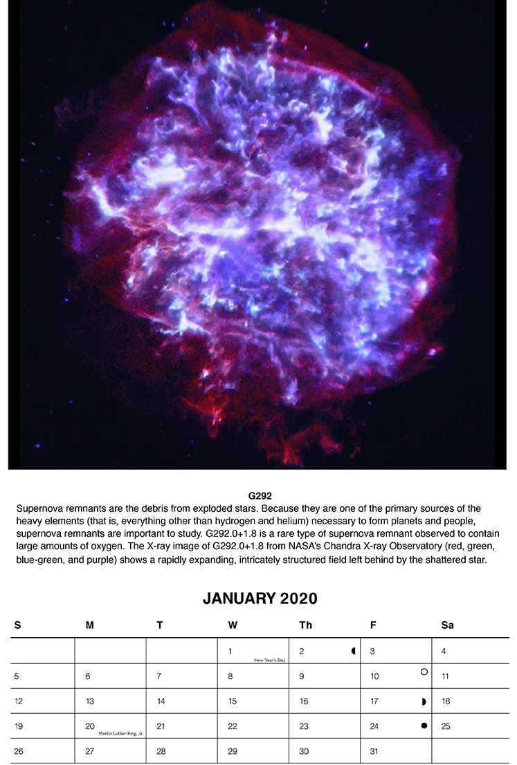 Print your own 2020 Chandra calendar with spectacular images from the past year. Featured objects include supernova remnants, clusters of galaxies, gravitational waves and beyond. Available as a 12-page full color PDF. Individual months may also be downloaded separately. Links for image descriptions and credits are provided below.