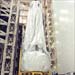 In the Vertical Processing Facility (VPF), workers keep watch on the crane lifting the shrouded Chandra X-ray Observatory to a vertical position.