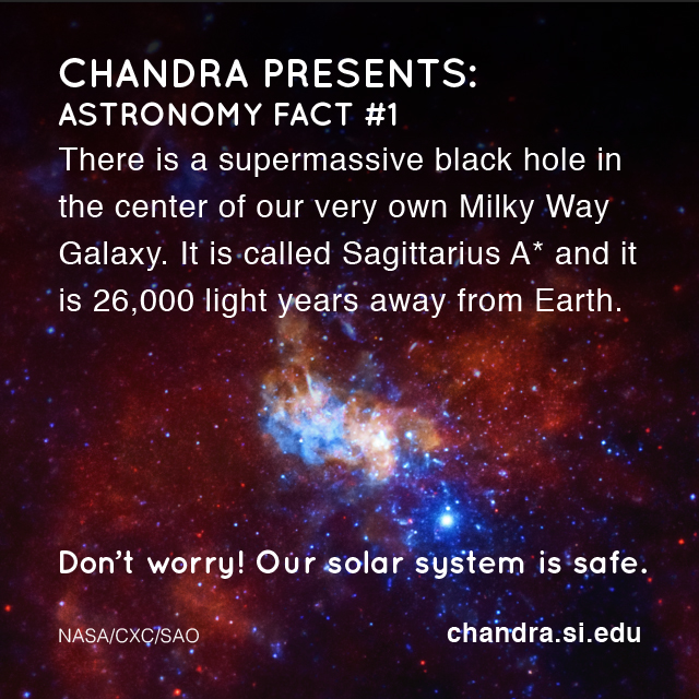 There is a supermassive black hole in the center of our very own Milky Way Galaxy. It is called Sagittarius A* and it is 26,000 light years away from Earth.