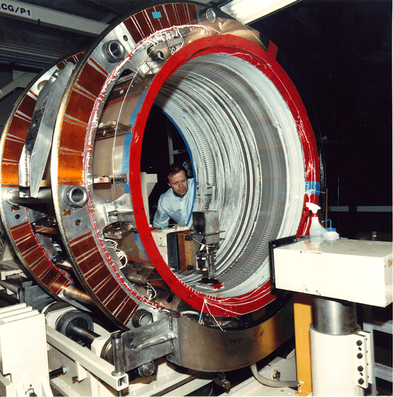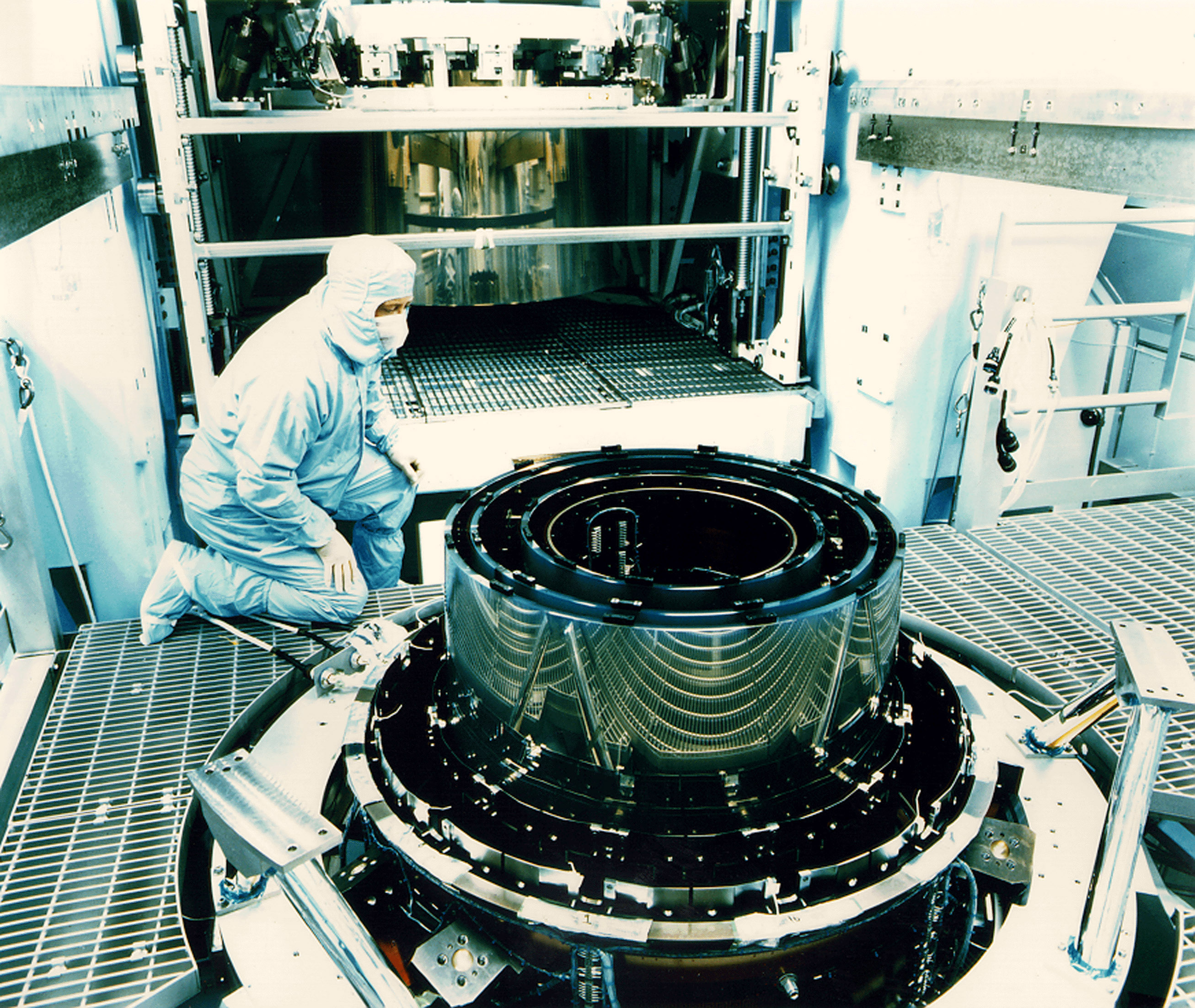 The largest of eight mirrors for Chandra is shown at the Eastman-Kodak laboratory, where the circular support structure was built.