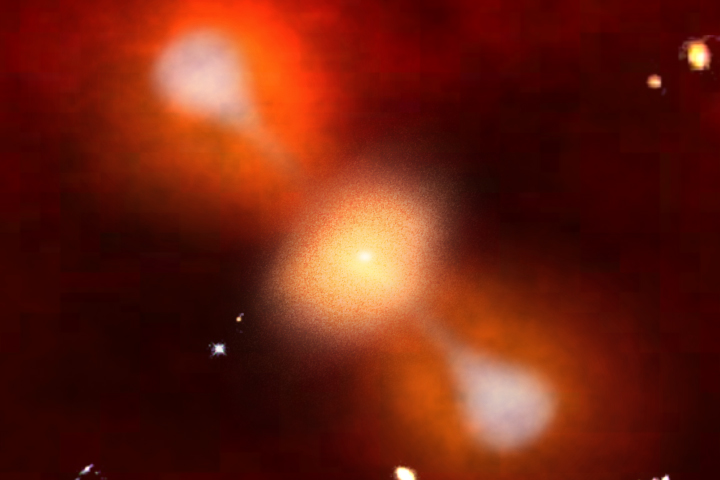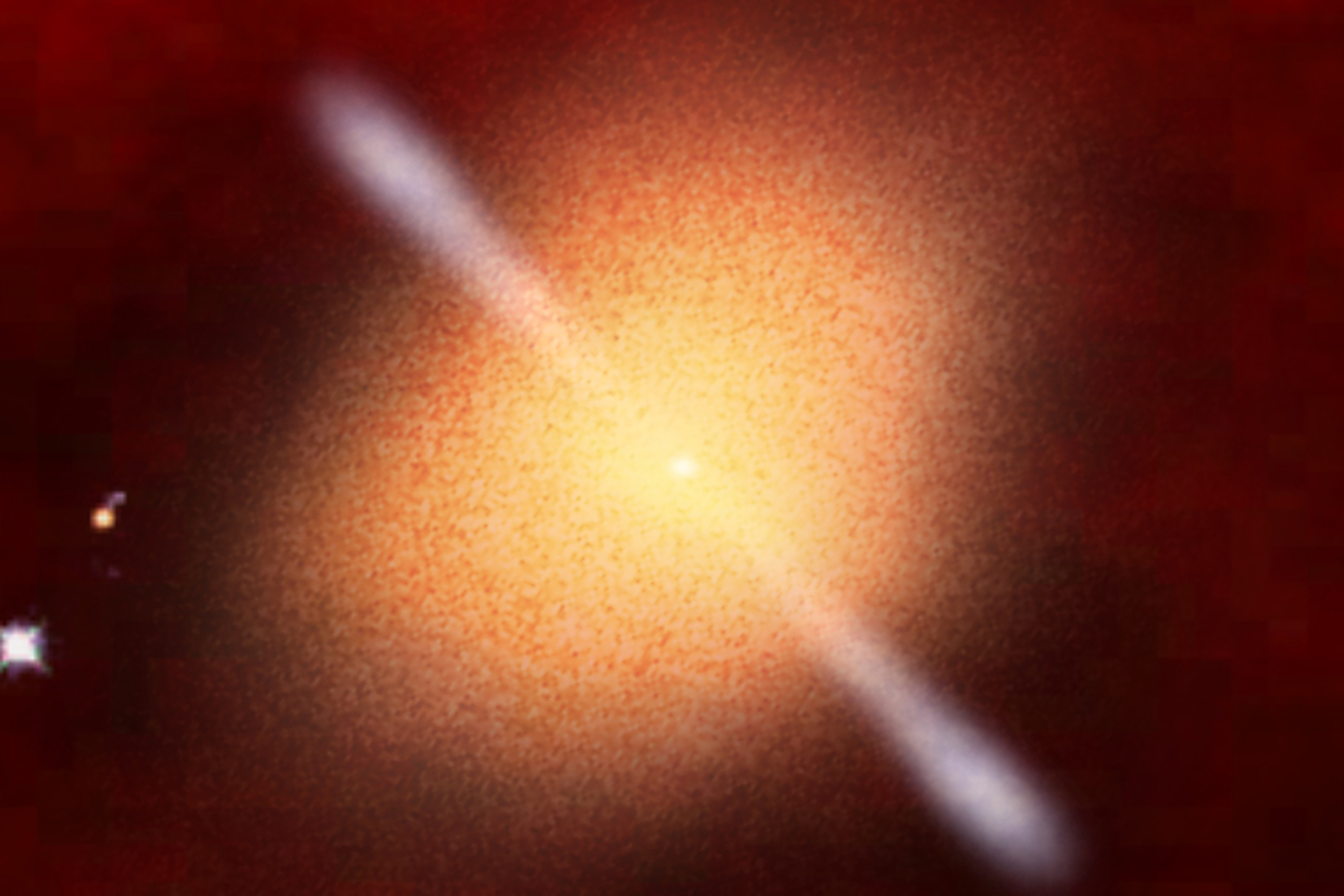 This illustration outlines the physical processes that created the image of Cygnus A observed by the Chandra X-ray Observatory.(Illustration: CXC/K.Kowal)