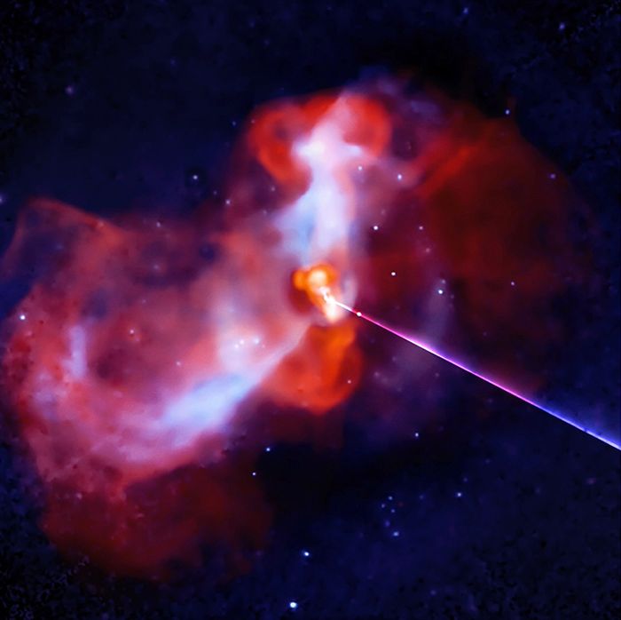 The giant black hole in Messier 87 (M87 for short) and its surroundings have been studied for many years and by a range of telescopes including Chandra (blue) and the Very Large Array (red and orange). This data shows that the black hole in M87 is sending out massive jets of energetic particles that interact with vast clouds of hot gas that surround it. To translate the X-rays and radio waves into sound, the image is scanned beginning at the 3 o’clock position and sweeping clockwise like a radar. Light farther from the center is heard as higher pitched while brighter light is louder. The radio data are lower pitched than the X-rays, corresponding to their frequency ranges in the electromagnetic spectrum. The point-like sources in X-ray light, most of which represent stars in orbit around a black hole or neutron star, are played as short, plucked sounds.