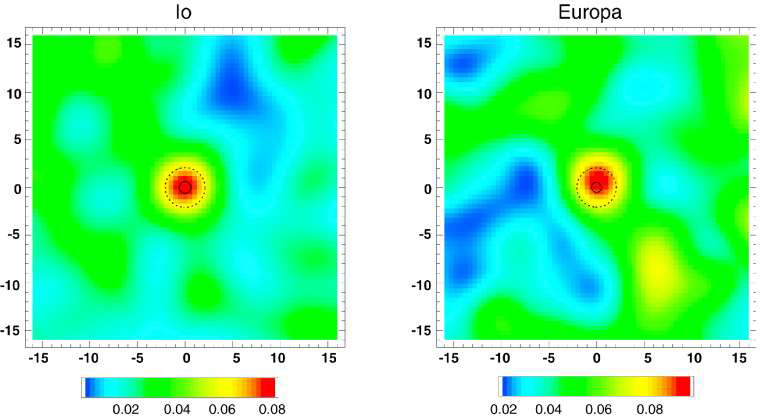 Weaker X-ray signals have been detected from two of Jupiter's moons, Io and Europa, and from the Io Plasma Torus, a doughnut-shaped ring of energetic particles that circles Jupiter. Gases such as sulfur dioxide are produced by Io's volcanos, escape from Io and are trapped in an orbit around Jupiter, where they are accelerated to high energies. Collisions between the particles within the Io Plasma Torus, and with the surfaces of Io and Europa can account for the observed X-rays.